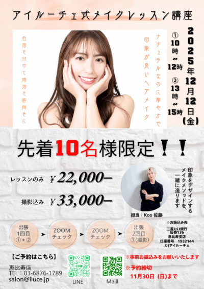 アイルーチェの二人が12月12日、再び仙台で今度は会員様向けのヘアメイク講習と撮影のイベントを開催されます。