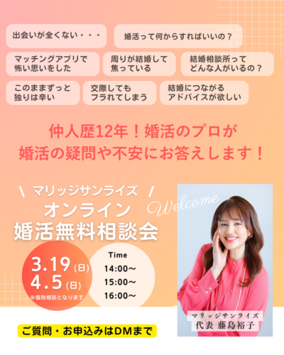婚活に不安を感じている方、アプリ婚活に疲れてしまった方、なるべく早く結婚したいと考えている方にも、安心してご相談いただけたらと思っています。