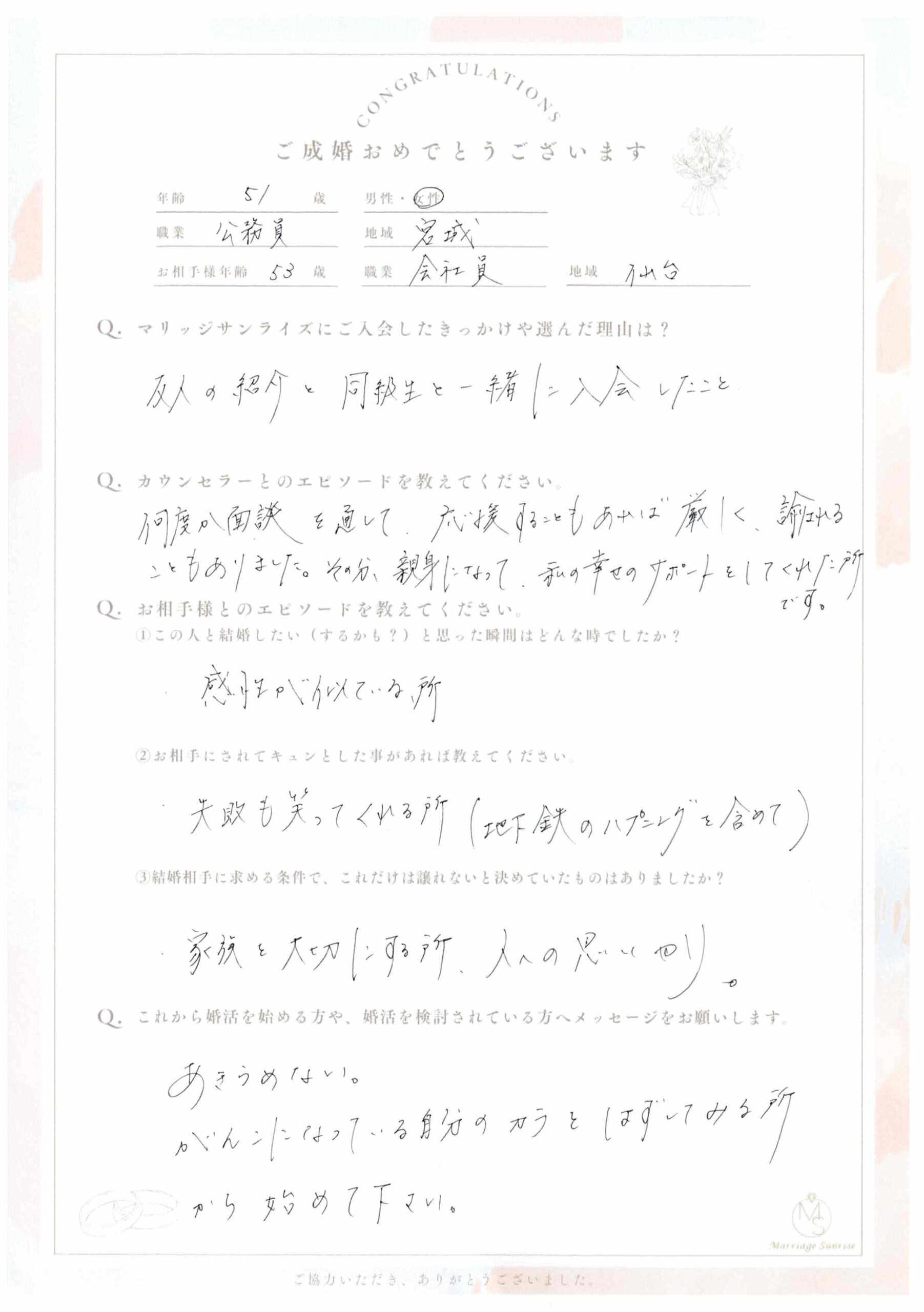 【4/2 NEW】50代公務員の女性会員様からご成婚アンケート☆